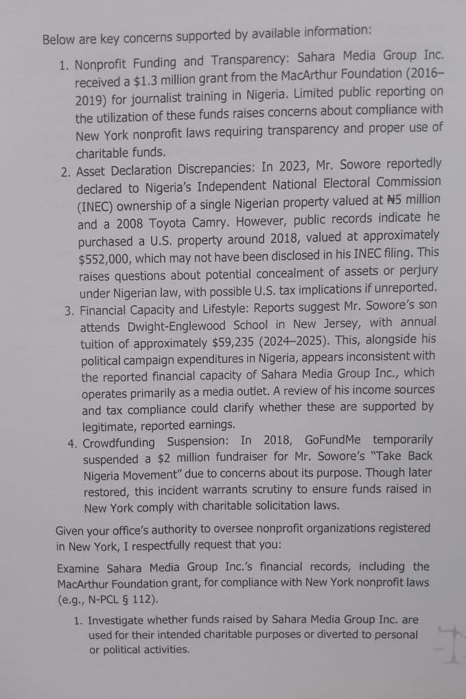 “Given your office’s authority to oversee nonprofit organizations registered in New York, I respectfully request that you examine Sahara Media Group Inc.’s financial records, including the MacArthur Foundation grant, for compliance with New York nonprofit laws (e.g., N-PCL § 112), investigate whether funds raised by Sahara Media Group Inc. are used for their intended charitable purposes or diverted to personal or political activities, review Mr. Sowore’s individual and corporate tax filings for compliance with U.S. tax laws, particularly regarding income supporting his U.S. property and lifestyle and suspend, and or invalidate his U.S travel documents.