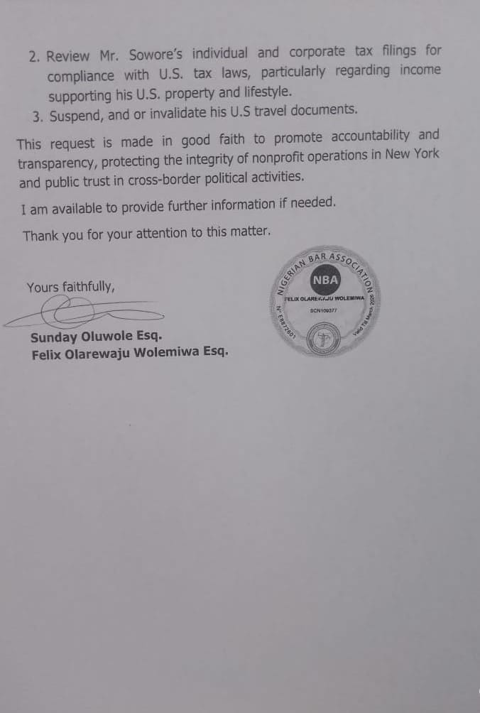The petition titled; “Request for Investigation into Financial Activities of Sahara Media Group Inc. and Mr. Omoyele Sowore,” read; “We are writing to respectfully request your office’s review of the financial activities of Sahara Media Group Inc., a New York-registered entity, and its founder, Mr. Omoyele Sowore, a Nigerian citizen residing in the United States. This request stems from concerns about potential discrepancies in nonprofit financial reporting, tax compliance, and asset declarations, which may impact both U.S. and Nigerian public interests.