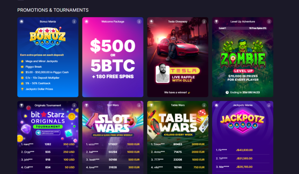 - Game Selection: Slots, Table Games, Jackpots, Live Casino, Game Shows, BitStarz Originals.